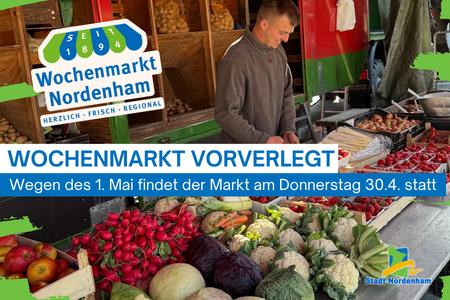 Der Wochenmarkt in Nordenham wird in dieser Woche aufgrund des Feiertages am 1. Mai vorverlegt.Statt am Freitag findet der Markt bereits am Donnerstag, den …